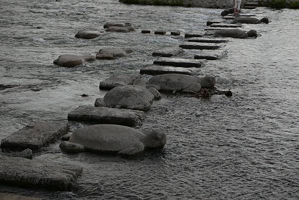 波光粼粼的河面上,有著幾顆烏龜形狀的大石頭,沿著河流,並排到對岸,形成一條石烏龜的水中道路。