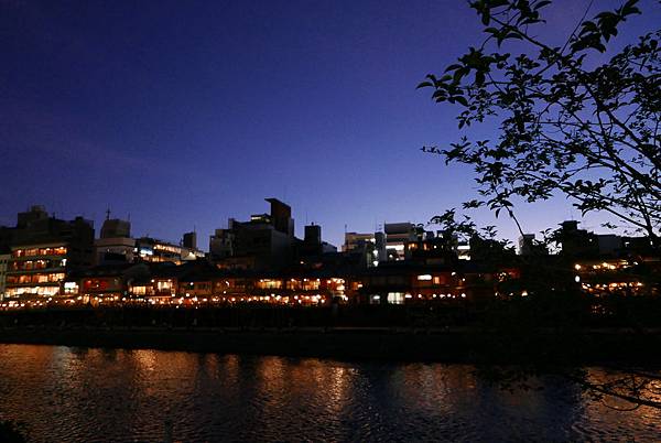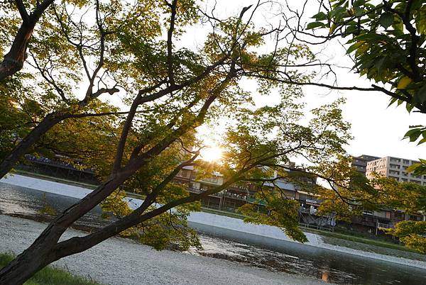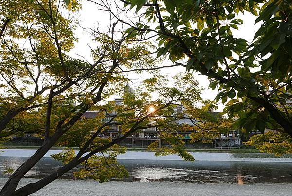 漸漸西沉的太陽將和煦的光灑落在鴨川上,隨著河水流動,粼粼閃閃。
